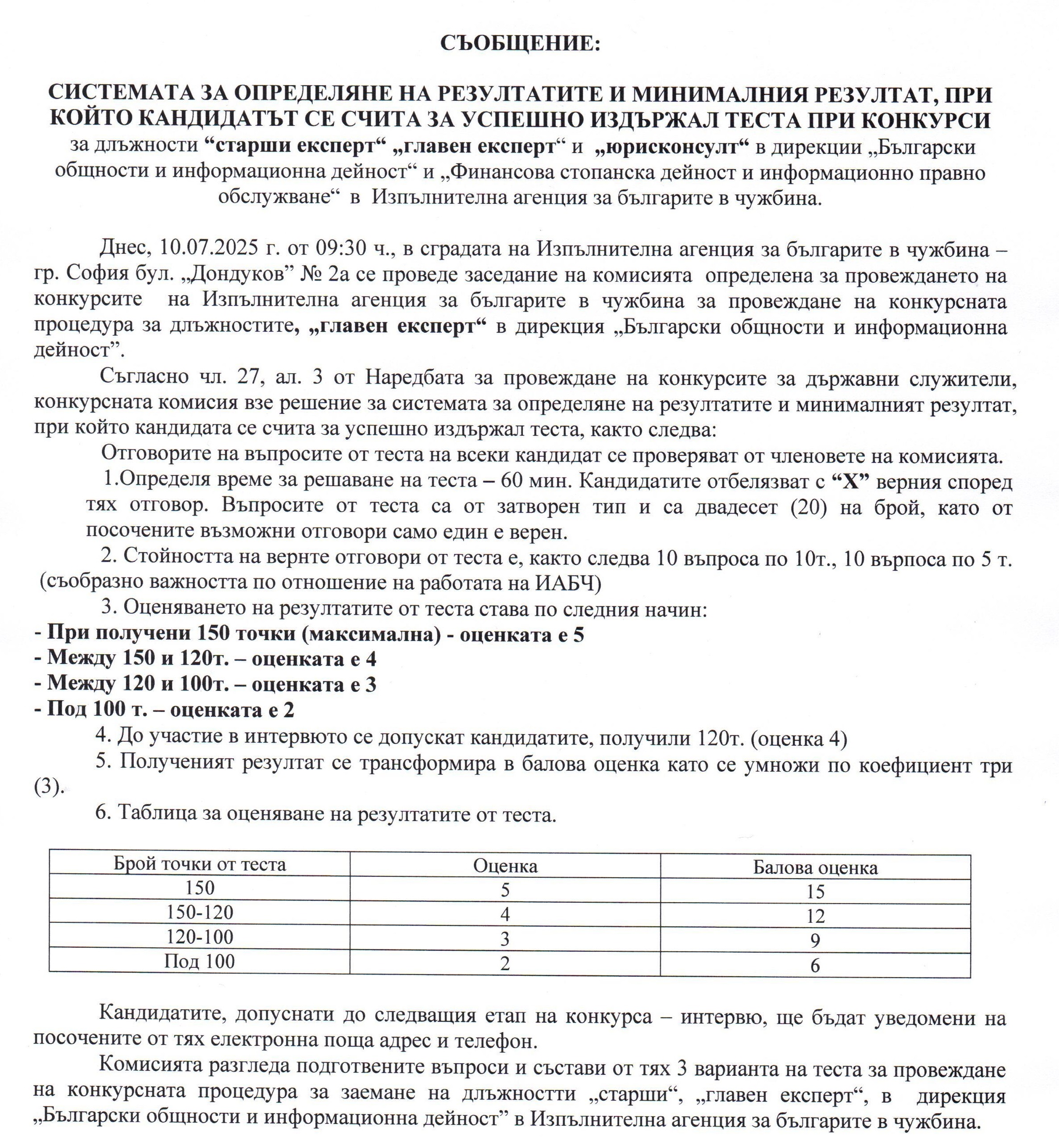 - СИСТЕМАТА ЗА ОПРЕДЕЛЯНЕ НА РЕЗУЛТАТИТЕ И МИНИМАЛНИЯ РЕЗУЛТАТ, ПРИ КОЙТО КАНДИДАТЪТ СЕ СЧИТА ЗА УСПЕШНО ИЗЪДРЖАЛ ТЕСТА ОТ КОНКУРСА